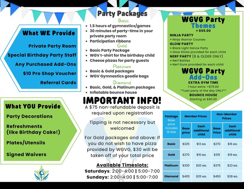 *cake, beverages, decorations, and utensils not provided by WGV Gymnastics
